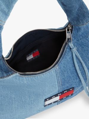 La borsa a spalla, caratterizzata dalla forma morbida e dallo stile rétro, è realizzata con sezioni in denim rigido a motivo patchwork.