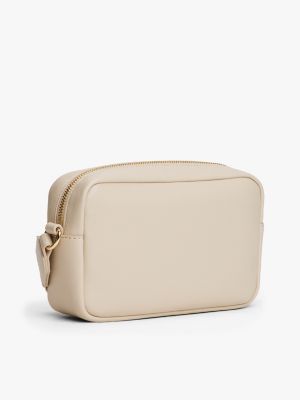 La compatta camera bag colpisce per il design tono su tono, ravvivato dal logo metallizzato e dalla finitura in tessuto della tracolla.