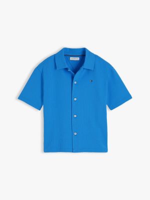 La versatile camicia in seersucker a maniche corte, arricchita dalla bandierina ricamata, combina il colletto classico all'originale finitura tramata.