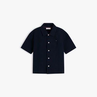 La versatile camicia in seersucker a maniche corte, arricchita dalla bandierina ricamata, combina il colletto classico all'originale finitura tramata.