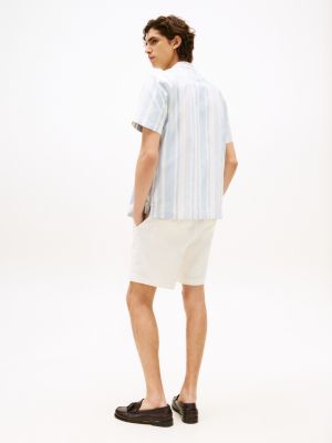 Ravviva i look estivi con la camicia in puro cotone, decorata dal motivo a righe verticali e rifinita dal collo cubano d'ispirazione rétro.