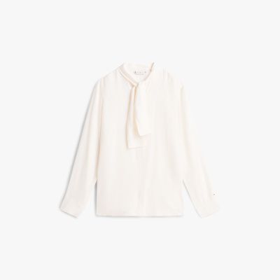 La raffinata camicia in jacquard di misto seta, valorizzata dal dettaglio che si annoda al collo, è perfetta da mattina a sera.