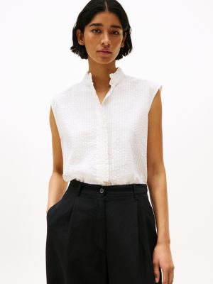 La camicia senza maniche in leggero seersucker di cotone, movimentata da graziose ruches, è una magistrale sintesi di raffinatezza e femminilità.