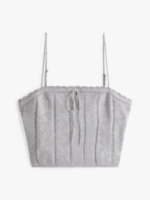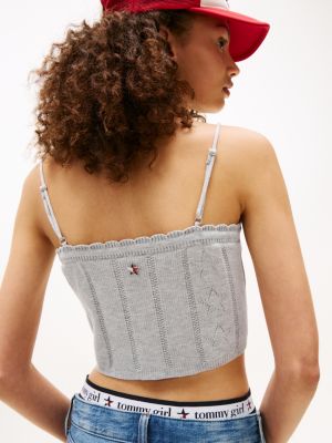 Le finiture a contrasto, abbinate al motivo pointelle a stelle, rendono la canotta stile 90s perfetta indossata da sola o con un outfit casual.