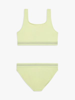 Rinnova il guardaroba da spiaggia grazie al completo bikini sportivo, composto da bralette con scollatura ovale e logo sull'elastico.