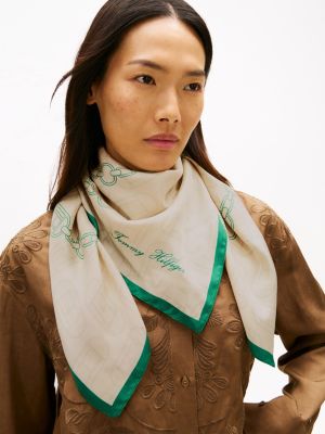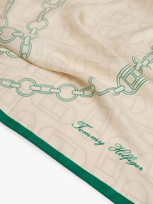 Il foulard in pura seta, decorato dal motivo con catenella all over, è un accessorio dal fascino nostalgico e irresistibilmente chic.