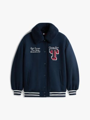 Il giubbino imbottito oversize in stile college, realizzato in twill di misto lana, si distingue per il caldo colletto rimovibile in sherpa.