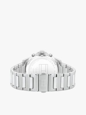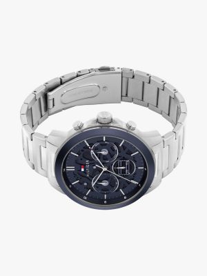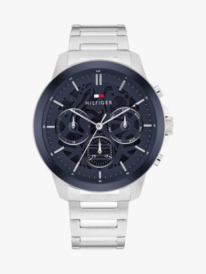Riscopri il fascino senza tempo del classico orologio in acciaio inossidabile, impreziosito dal sofisticato quadrante scheletrato e dalla lunetta color blu navy.