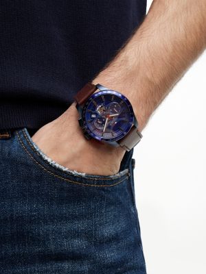 Aggiungi un tocco iconico ai tuoi look grazie all'orologio in stile racing, dotato di quadrante scheletrato multifunzione e cinturino in pelle marrone.