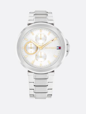 La finitura color argento del raffinato orologio in acciaio inossidabile crea un elegante contrasto con il blu brillante del quadrante effetto solare.