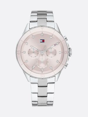 L'orologio in acciaio inossidabile, con la raffinata lunetta in ceramica rosa e gli indici delle ore impreziositi da cristalli, ha uno stile sofisticato ed elegante.