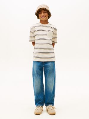 La classica T-shirt in puro cotone mélange, dotata di una pratica tasca sul petto, è ravvivata dall'originale motivo a righe e dai dettagli iconici.
