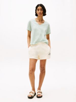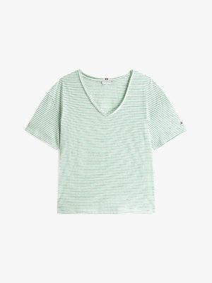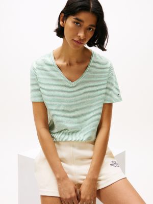 La T-shirt con scollatura a V è realizzata in misto cotone e lino dalla piacevole finitura tramata, per completare con stile i tuoi look di ogni giorno.